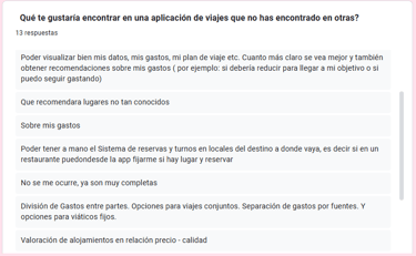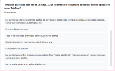 La entrevista a Arabela me permitió identificar que los usuarios como ella buscan una aplicación que les facilite la gestión de sus gastos de viaje. Valoran la facilidad de uso, la personalización y la posibilidad de visualizar sus gastos de forma clara. Además, mostraron interés en compartir sus experiencias con otros viajeros. Estas conclusiones fueron fundamentales para definir las características clave de Tripflow y garantizar que respondiera a las necesidades reales de nuestros usuarios.