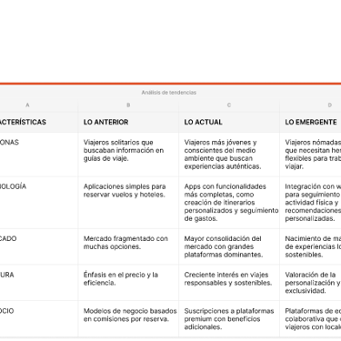 El análisis de tendencias reveló una evolución significativa en el comportamiento de los viajeros. Identifiqué una creciente demanda por experiencias personalizadas, sostenibles y tecnológicamente avanzadas.