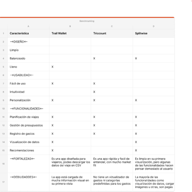 El análisis del benchmarking me permitió identificar las fortalezas y debilidades de las aplicaciones competidoras, así como las oportunidades para que Tripflow se diferencie y se posicione como la mejor opción para los viajeros.