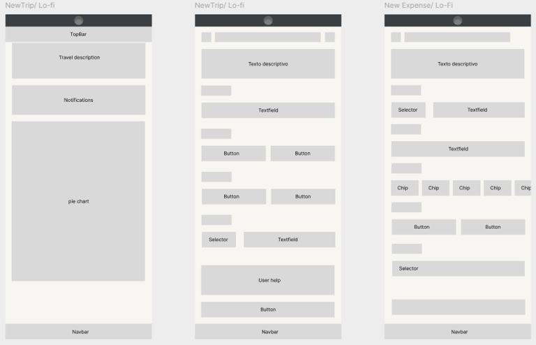 Para validar rápidamente la idea y obtener feedback temprano, comencé el proceso de diseño creando wireframes de baja fidelidad. Estos me permitió visualizar la estructura básica de la interfaz y ajustar el diseño antes de pasar a un prototipo de mayor fidelidad.