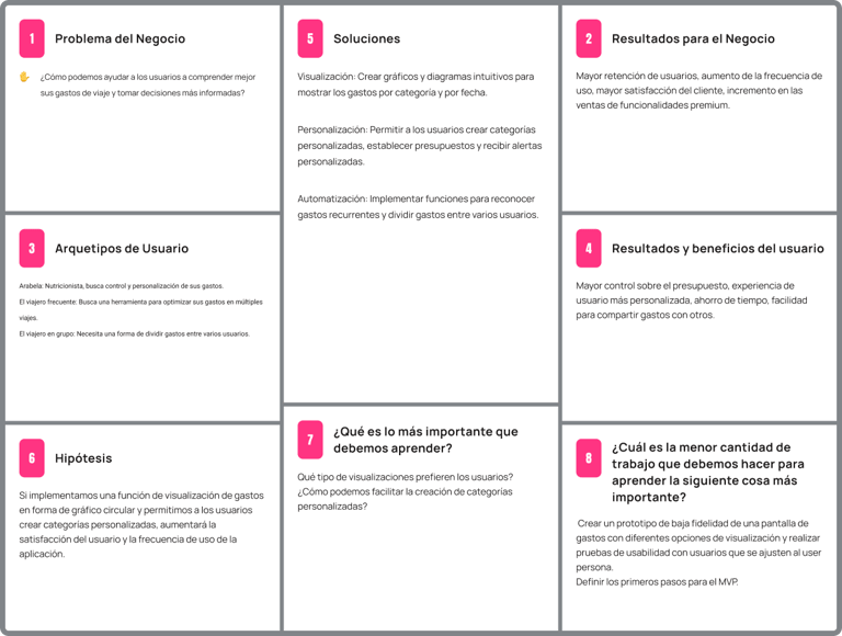 Utilicé el Lean UX Canvas para generar y evaluar una gran cantidad de ideas en un corto período de tiempo. Al visualizar las diferentes componentes del producto en un solo lugar, pude identificar rápidamente las oportunidades y los desafíos. El canvas me ayudó a tomar decisiones informadas sobre las funcionalidades a incluir en el MVP de Tripflow.